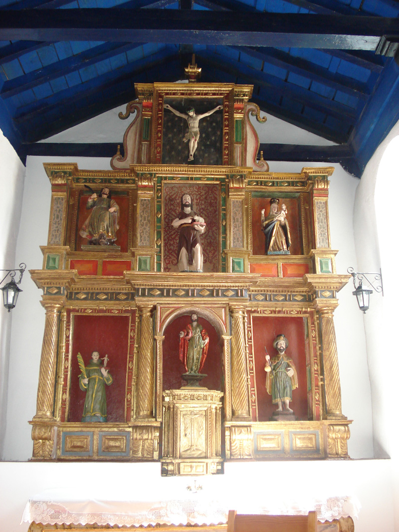 En el arco toral hay un Cristo barroco. El retablo mayor tiene tres calles con cuerpos, el primero con estrías en espiral del siglo XVII y el segundo añadido en el sigloXVIII. En el ático se conserva un Santiago Peregrino de resonancias románicas, siendo las demás imágenes barrocas y de cierto mérito.