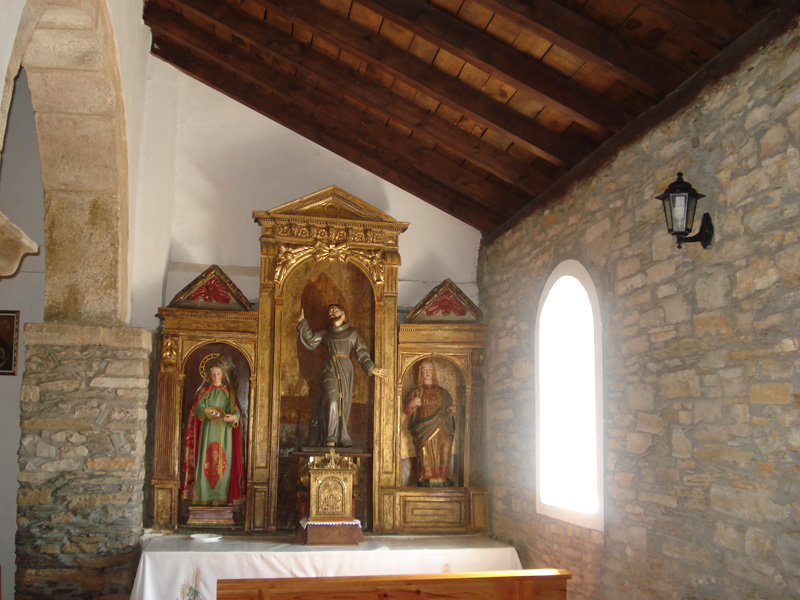El retablo lateral izquierdo es barroco con estípites y multitud de finos adornos (primera mitad del siglo XVIII) lo mismo que su imagen del Rosario. En el retablo derecho se venera a San Francisco recibiendo las llagas, Santa Lucia y la Magdalena con su tarro de perfume, sigue el modelo de rostro que se repite en El Bierzo en el siglo XVI. Fue restaurada por los vecinos en el año 2003.
